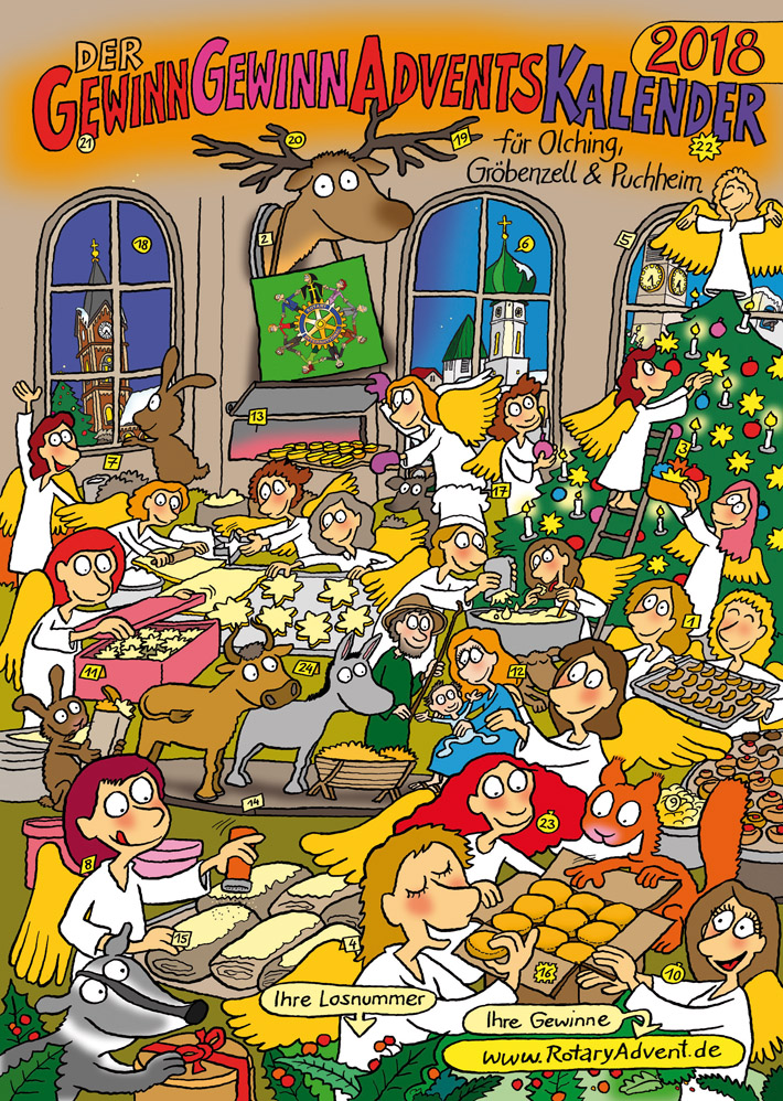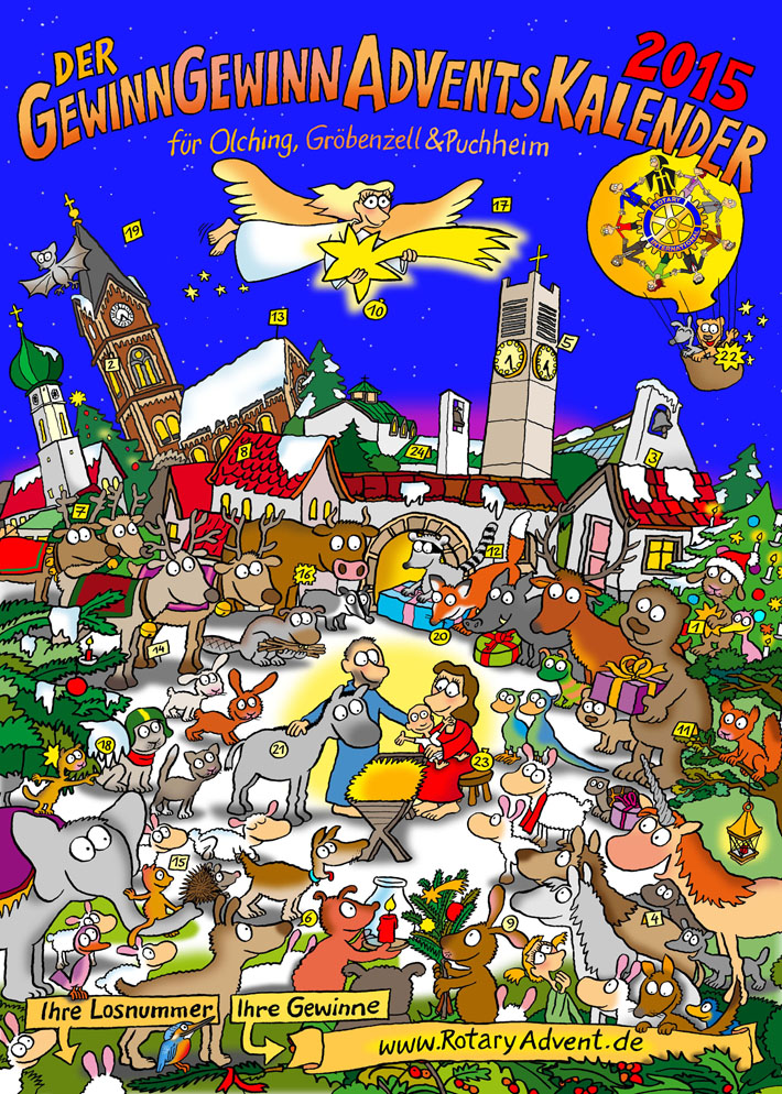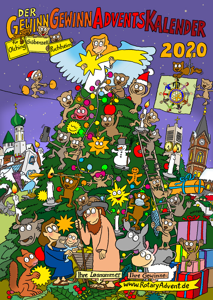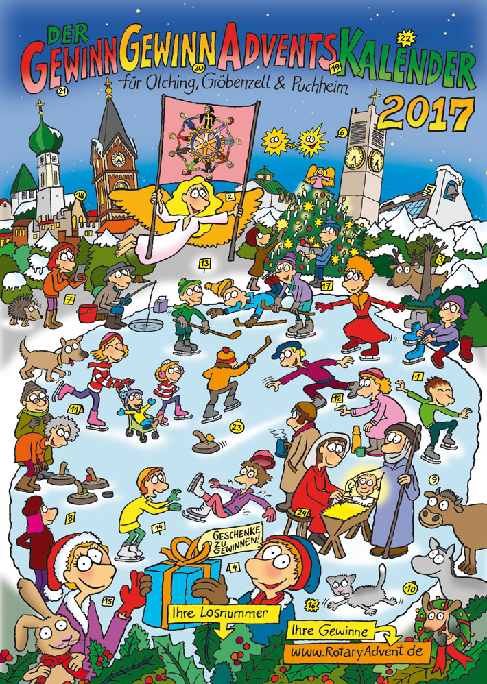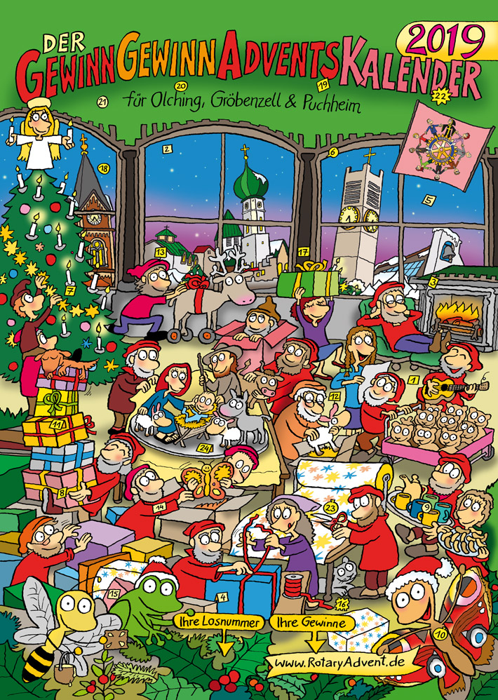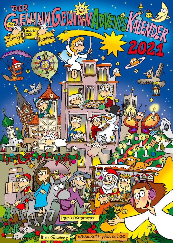 Einen Blick auf den Weihnachtsmarkt erlaubt die diesjährige Ausgabe des Adventskalenders des Rotary Clubs München-West, der ab sofort wieder erhältlich ist. Der beliebte Adventskalender wird gezeichnet vom Erfolgsautor Werner Tiki Küstenmacher und zum Preis von 7 Euro verkauft. Die Bürgerinnen und Bürger können damit nicht nur Gutes tun, sondern auch eine von 640 Überraschungen gewinnen. Der Reinerlös des Adventskalenderverkaufs kommt den Sozialfonds der Gemeinden Gröbenzell, Olching und Puchheim sowie erstmalig der Nicolas-May-Stiftung zugute.
